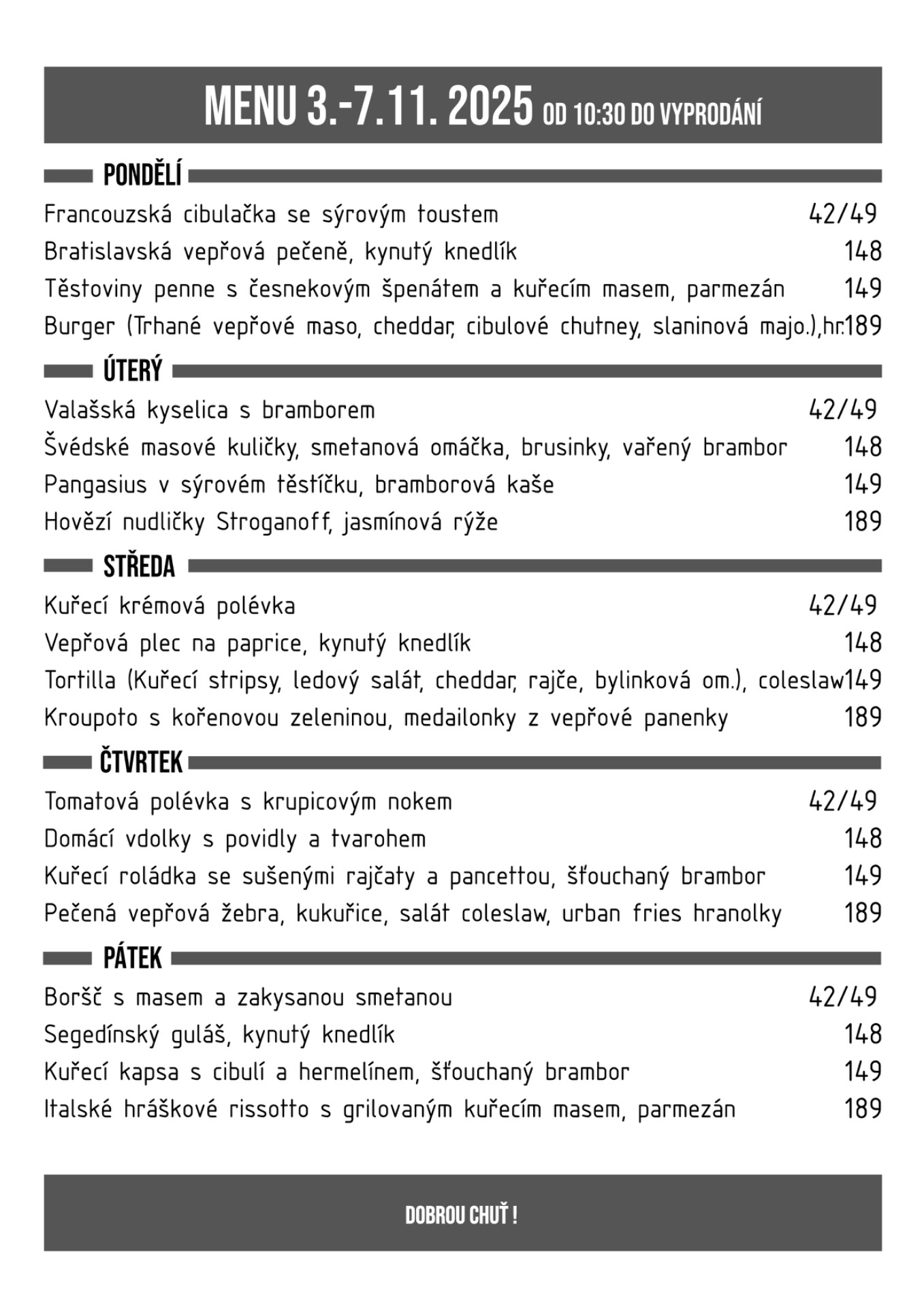 Vaříme pro Vás 7 dnů v týdnu. Od pondělí do pátku obědové menu, o víkendech speciální nabídky a ve stálém jídelním lístku najdete mimo jiné BURGERY a TEX-MEX. Stavte se na pořádné jídlo, nebo skvělé točené.