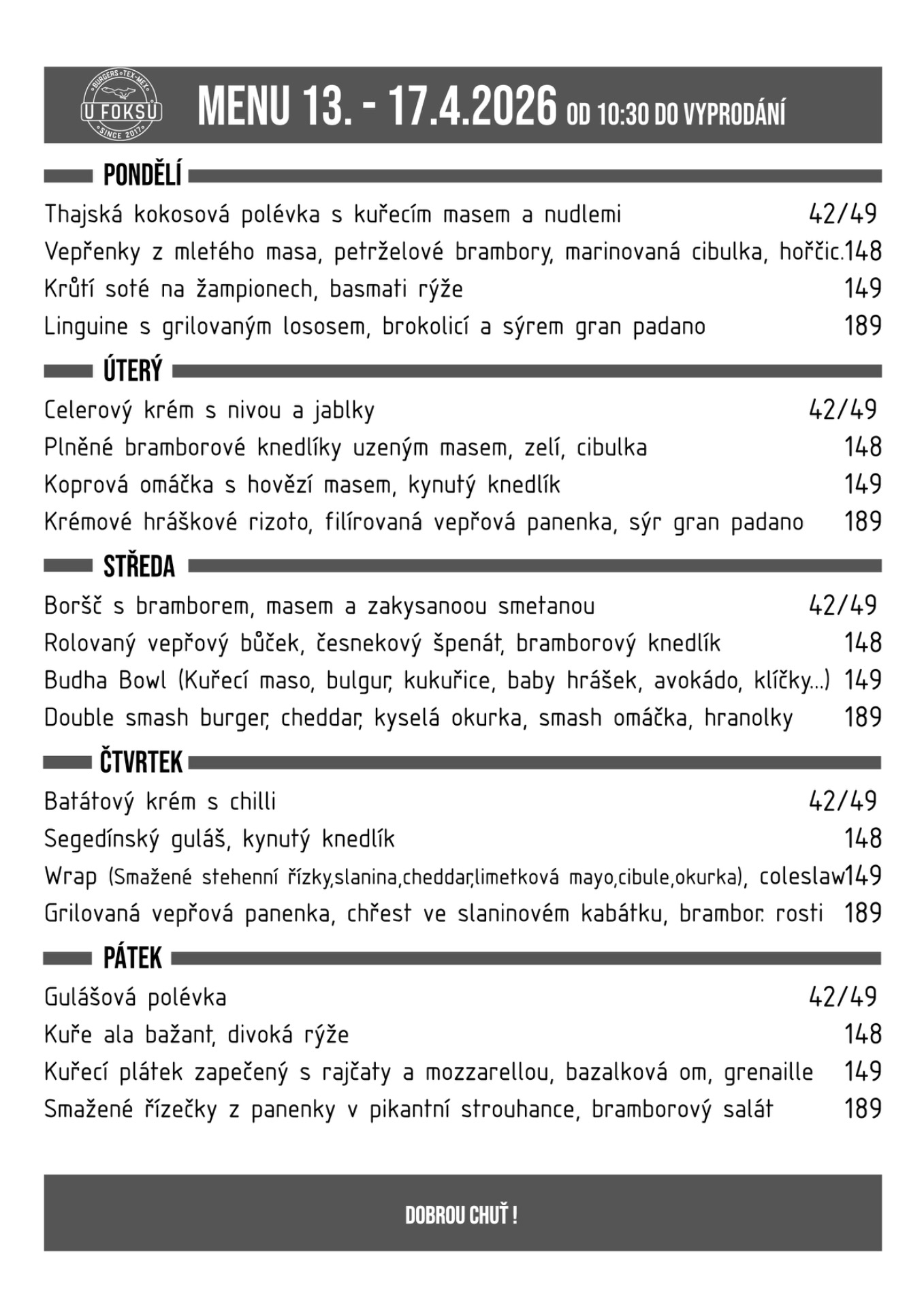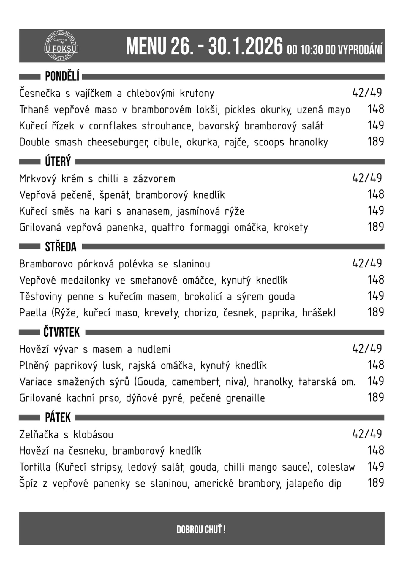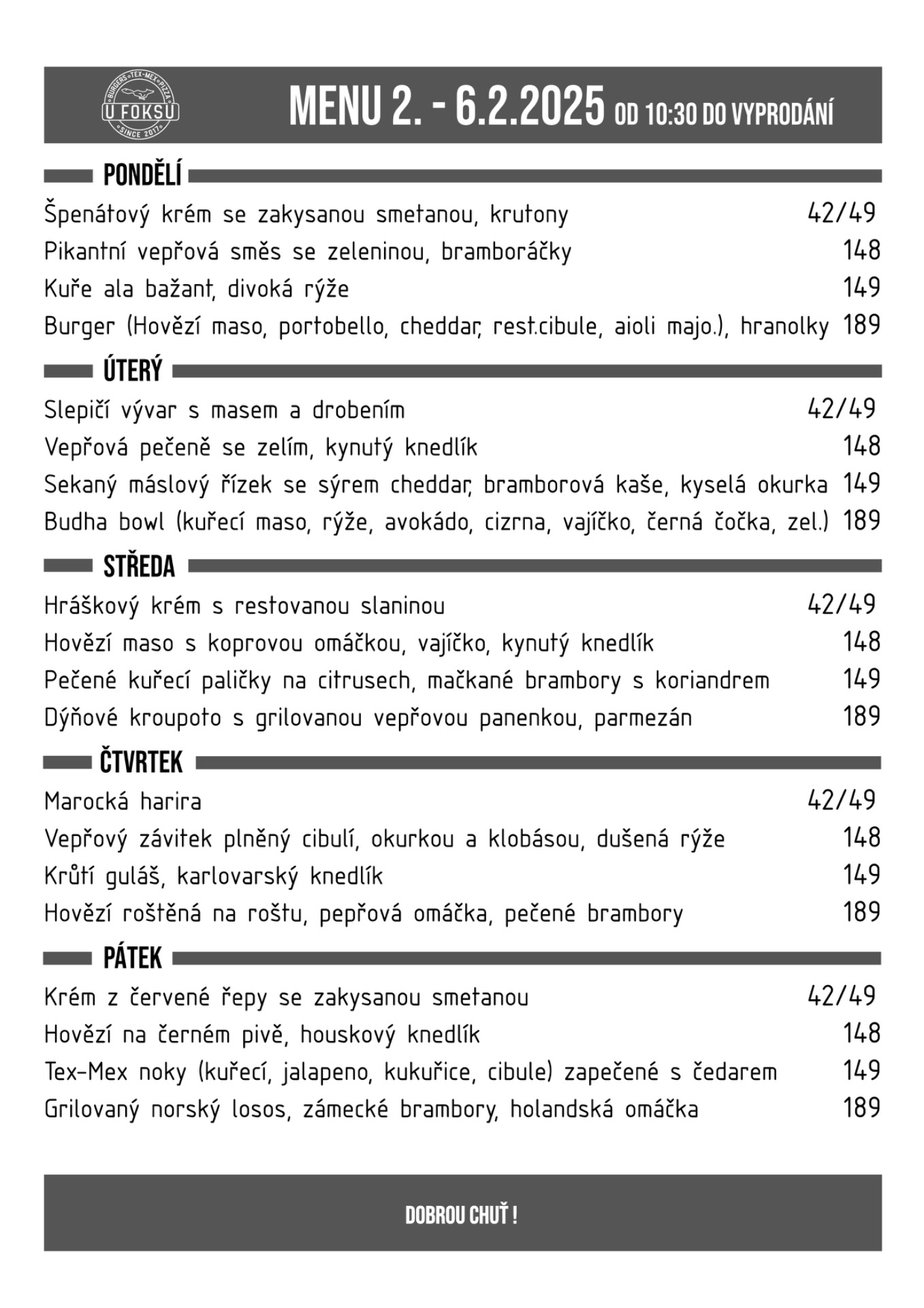 Vaříme pro Vás 7 dnů v týdnu. Od pondělí do pátku obědové menu, o víkendech speciální nabídky a ve stálém jídelním lístku najdete mimo jiné BURGERY a TEX-MEX. Stavte se na pořádné jídlo, nebo skvělé točené.